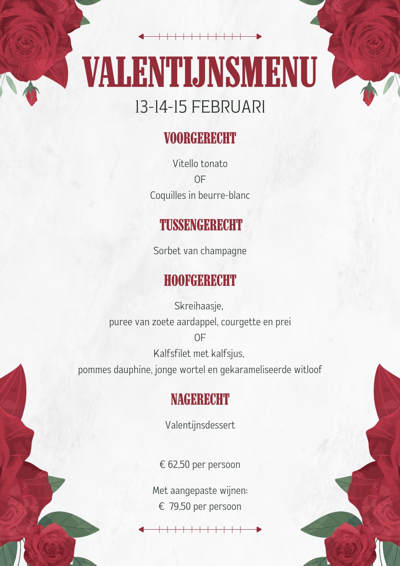 De valentijnsmenu is beschikbaar op vrijdagavond 13/02, zaterdag 14/02 en zondag 15/02